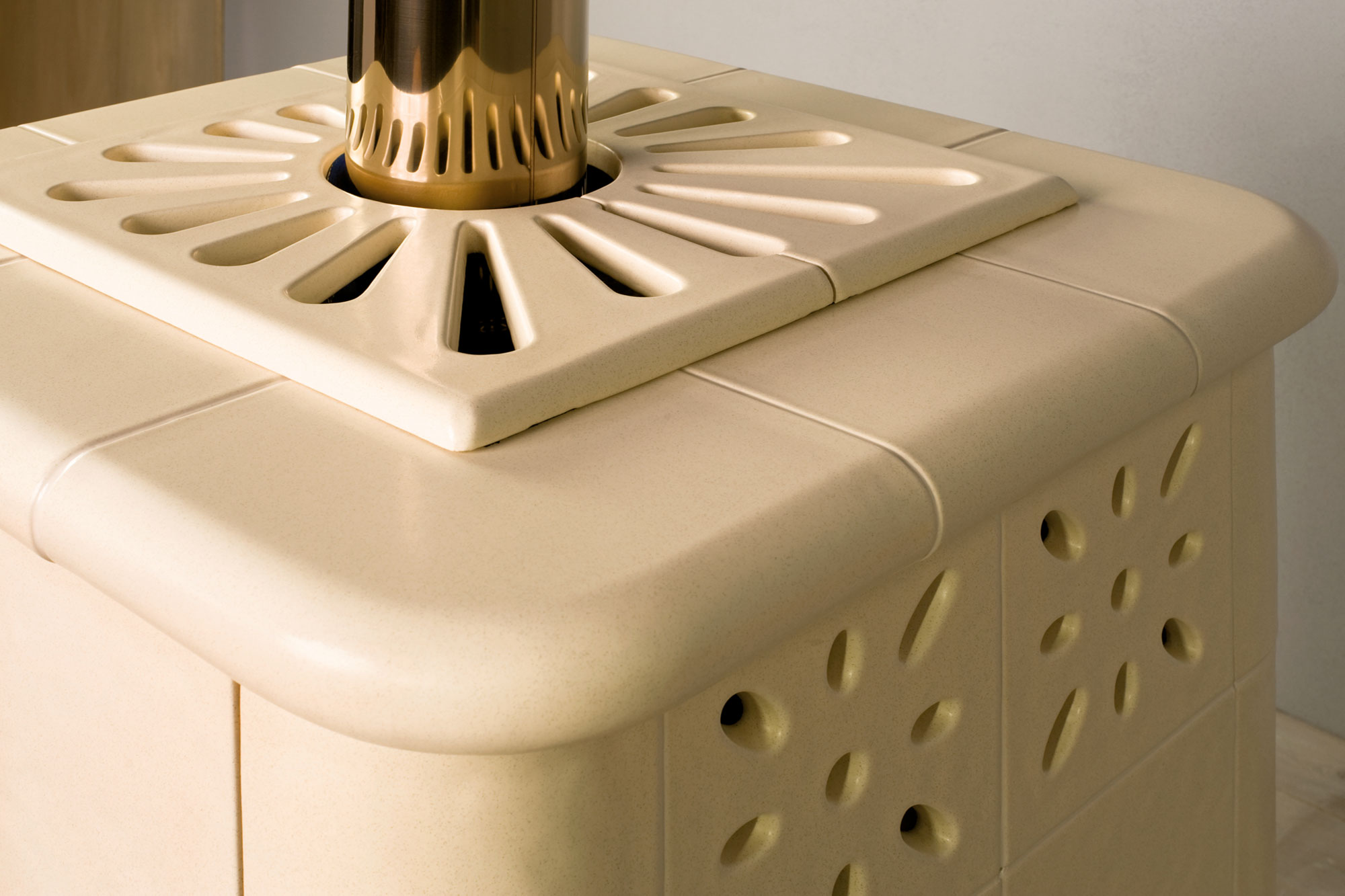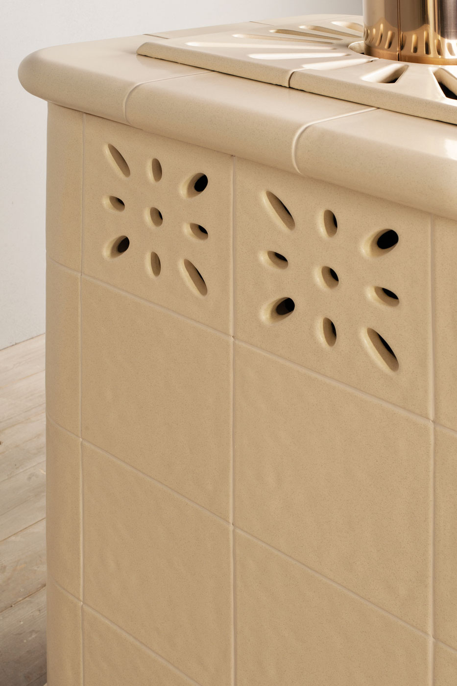 Le piastrelle in ceramica refrattaria realizzate in bassorilievo, vengono smaltate con lo stesso colore che hai scelto per la tua stufa, e si abbinano alla forma della ceramica modello 400.